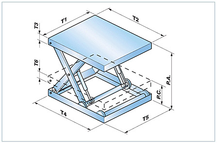平臺的尺寸? 上側 T1 =臺寬 T2 =臺長 T3 =框架的高度 下側 T4 =臺寬 T5 =臺長 T6 =框架的高度 打開 P.A. =打開長度 閉合 PC.=閉合長度 |