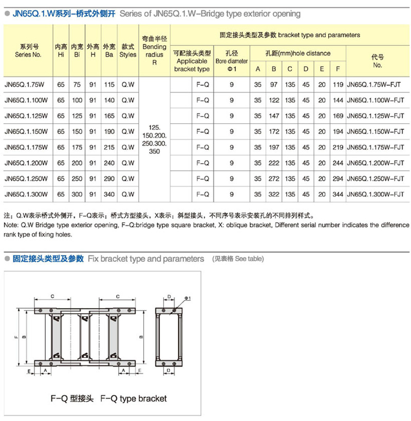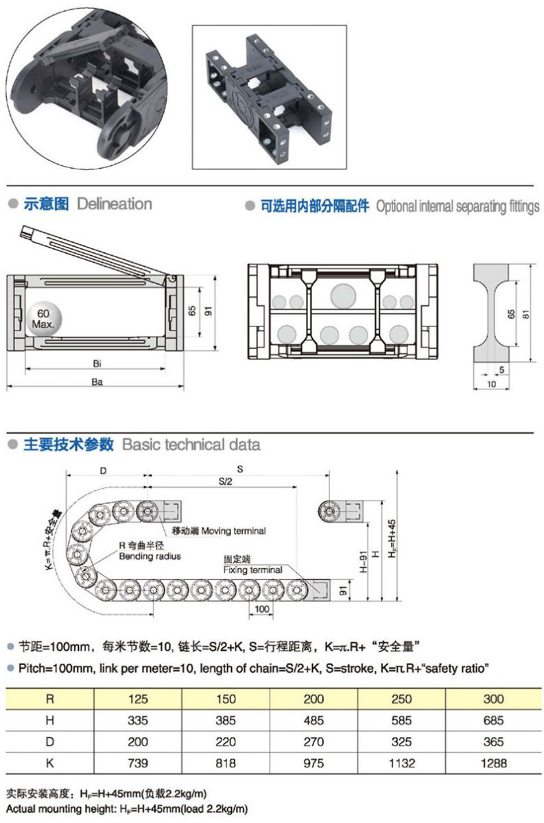 類型:拖鏈 材質:塑料 分類:中型 型號:JN65Q.1.W 長度:10個/ m 內高:65mm 內寬:75-300mm 彎曲半徑:125 150 200 250 300 應用機器:全部