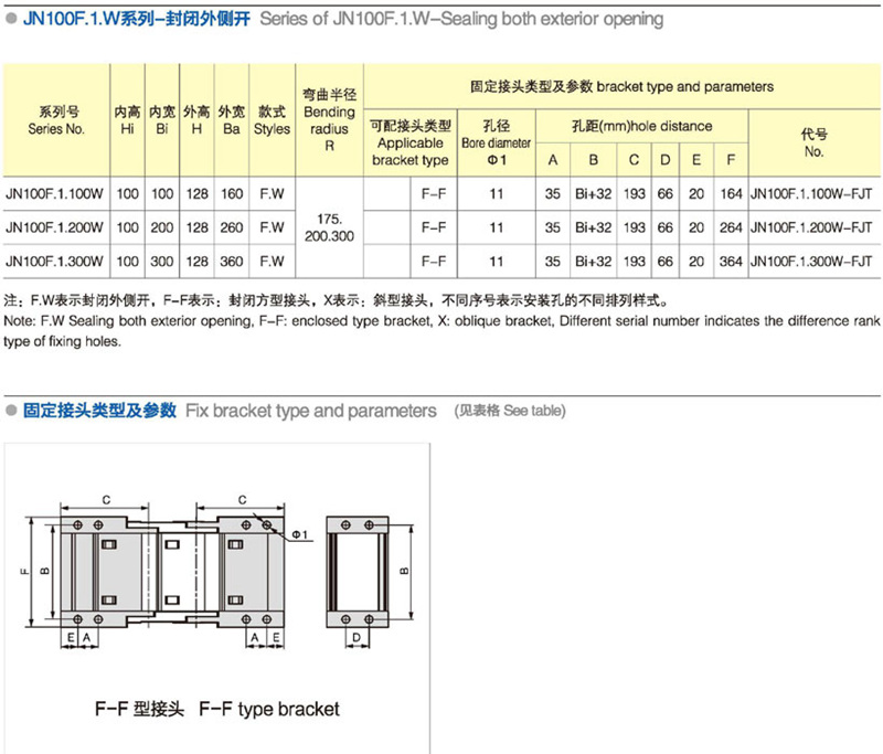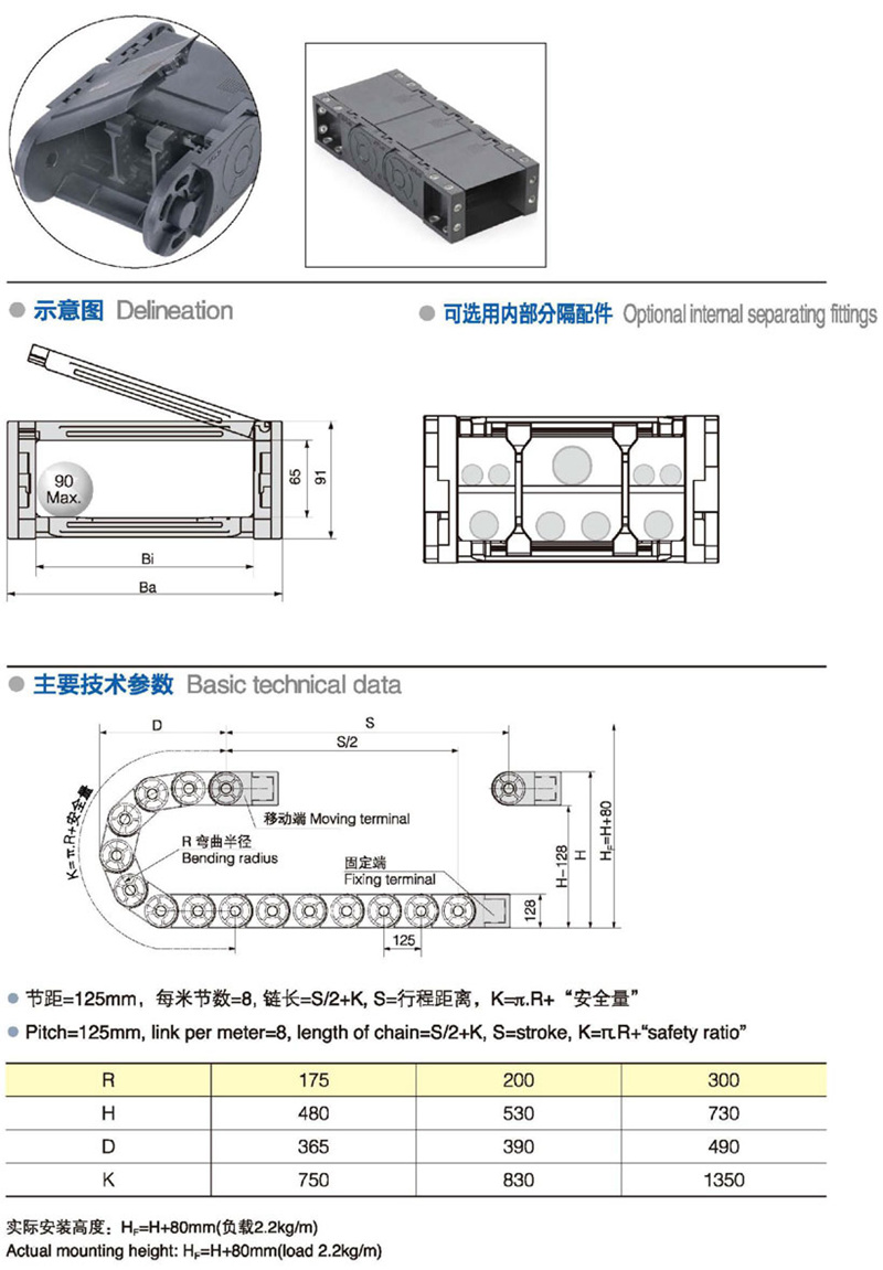 名稱: 拖鏈 材質:塑料 系列號: JN100F.1.W 長度: 8pitch/m 內高:100mm 內寬:100-300mm 彎曲半徑:175 200 300 應用機械:全部