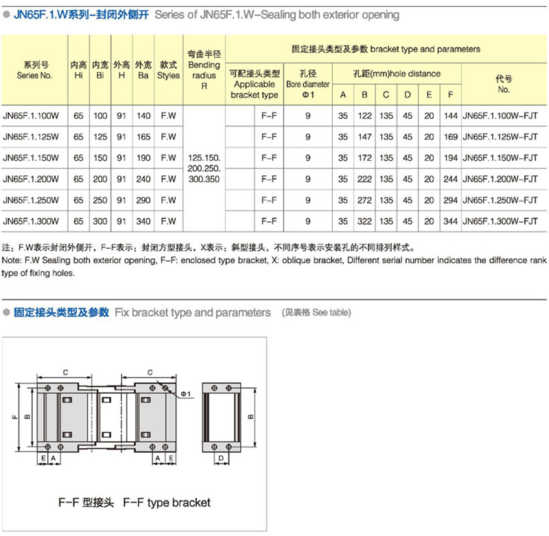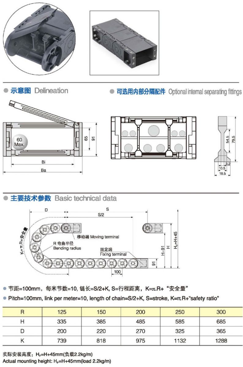 名稱: 拖鏈 材質:塑料 分類:中型系列 系列號: JN65F.1.W 長度: 10pitch/m 內高:65mm 內寬:100-300mm 彎曲半徑:100 125 150 200 250 300 應用機械:全部