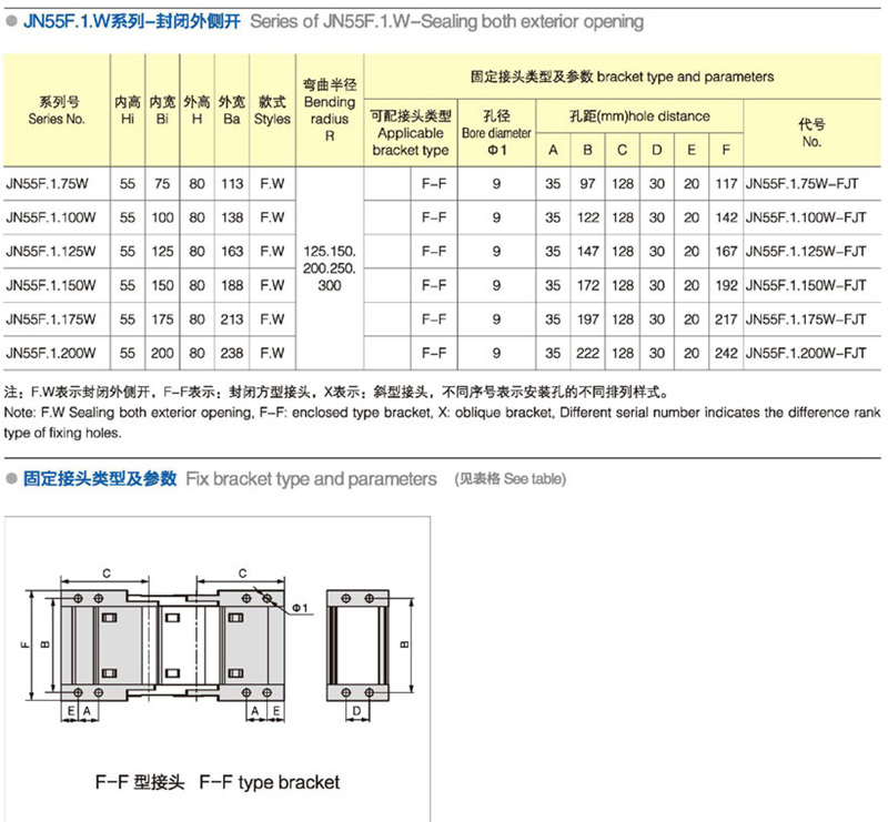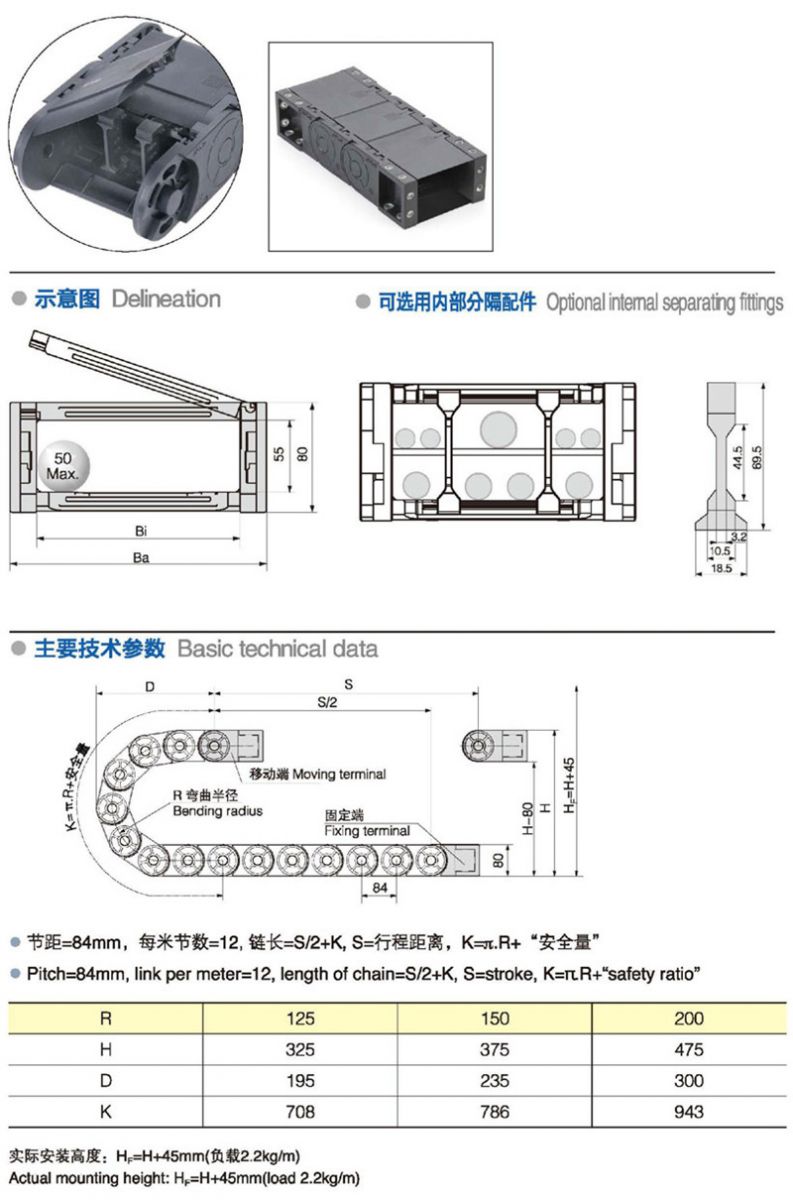 名稱: 拖鏈 材質:塑料 分類:中型系列 系列號: JN55F.1.W 長度: 12pitch/m 內高:55mm 內寬: 75-300mm 彎曲半徑:100 125 150 200 應用機械:全部