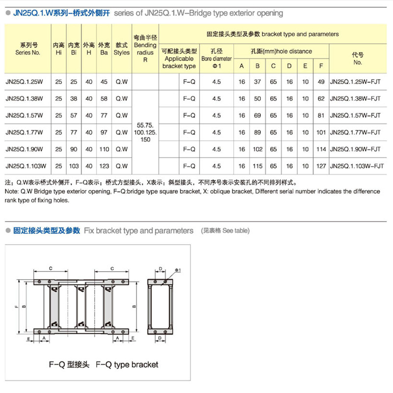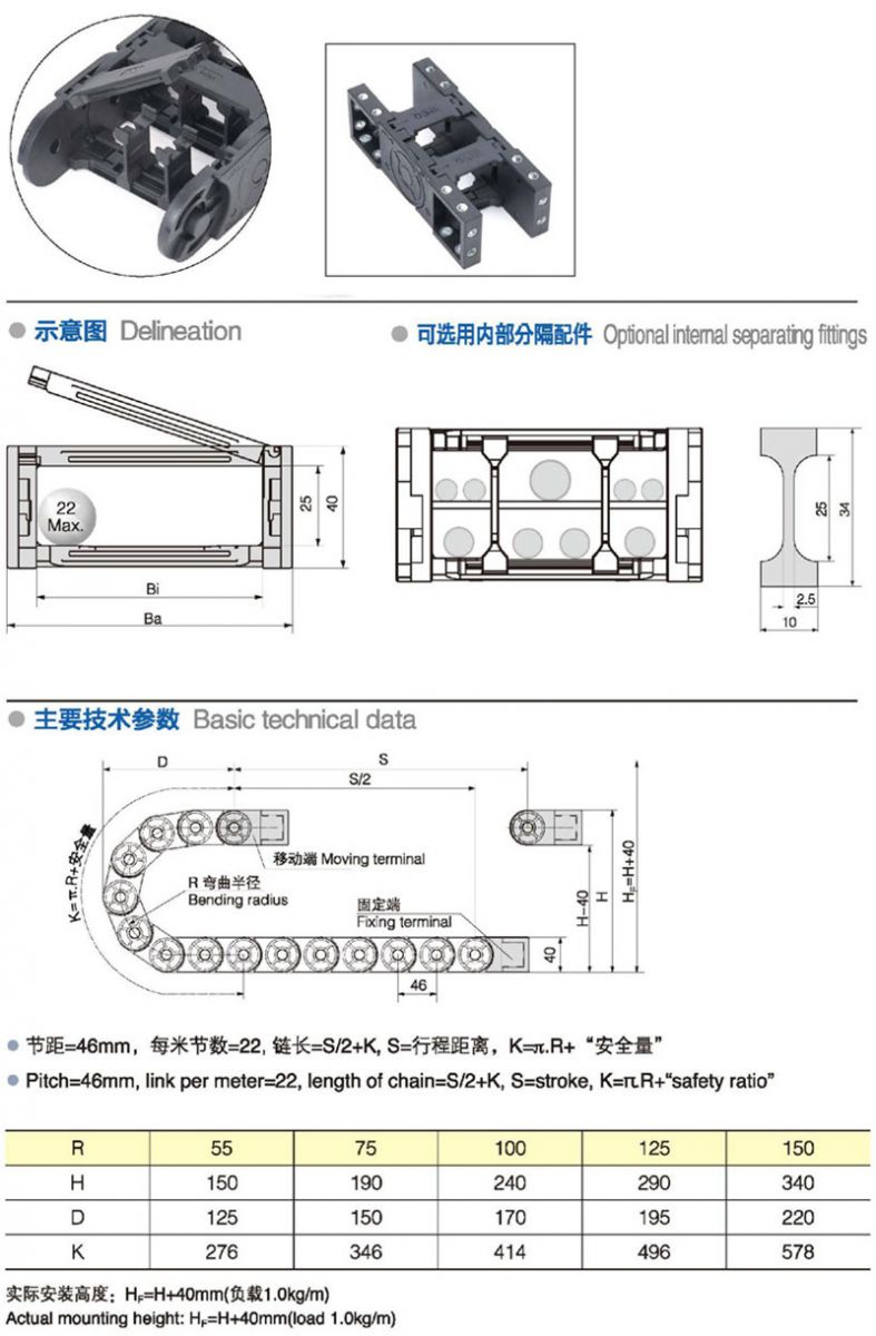 名稱:拖鏈 材質:塑料 系列號:JN25Q.1.W 長度:22pitch/m內高:25mm 內寬:25-50mm 彎曲半徑:5575100125150 應用機械:全部