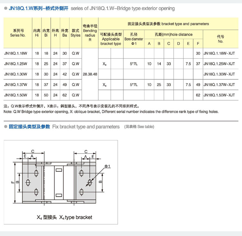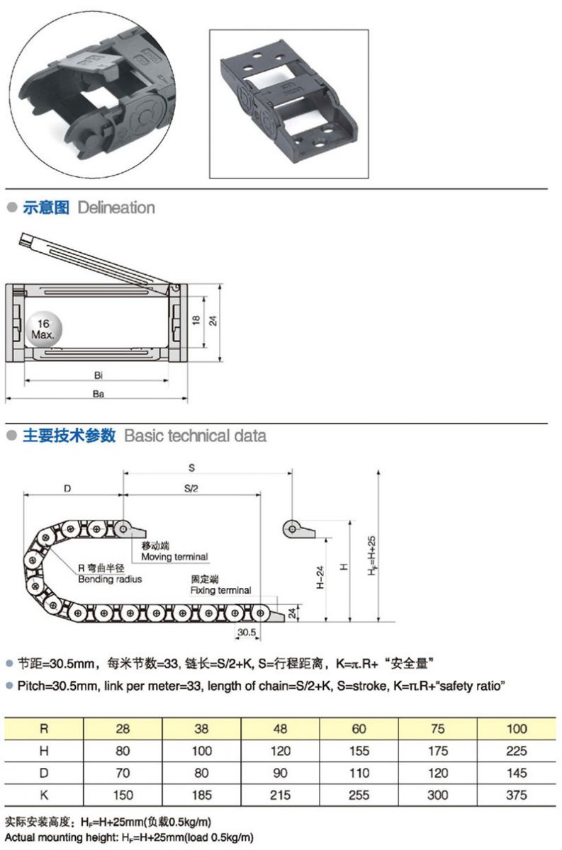名稱:拖鏈,斗式輸送機 材質:塑料 系列號:JN18Q.1.W 長度:33pitch/m內高:18mm 內寬:25-50mm 彎曲半徑:283848 應用機械:全部