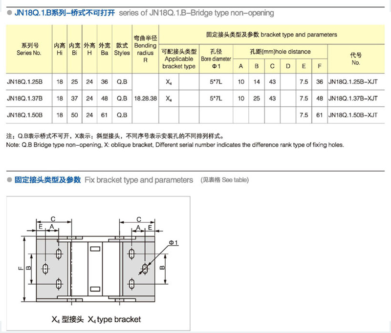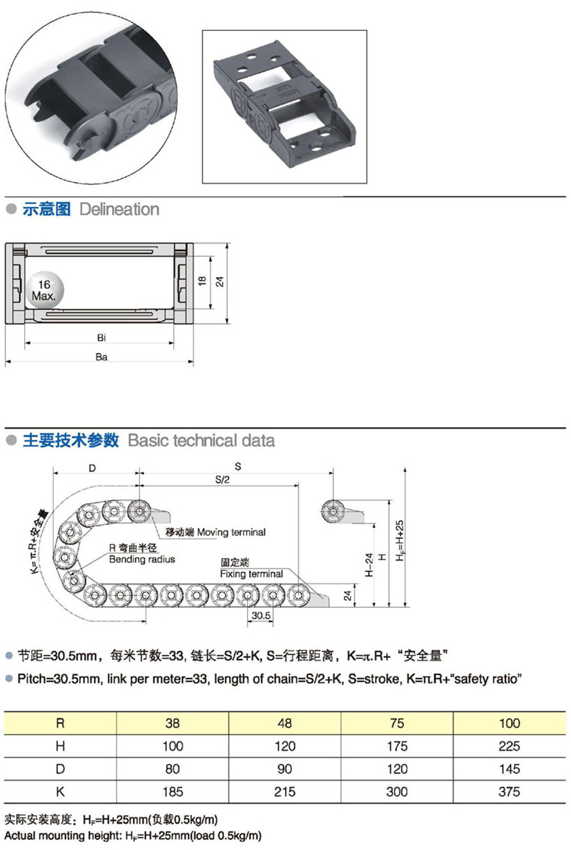 名稱:拖鏈,斗式輸送機 材質:尼龍 系列號:JN18Q.1.B 長度:33pitch/m內高:18mm 內寬:25-50mm彎曲半徑:283848 應用機械:全部