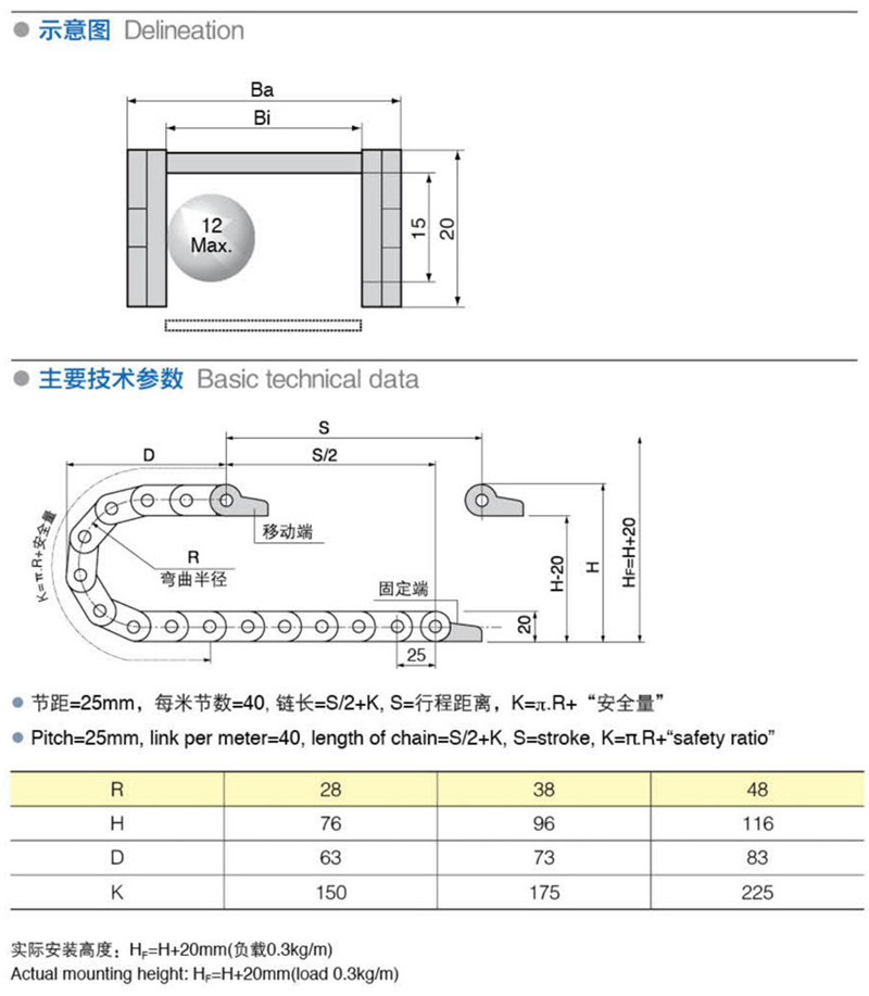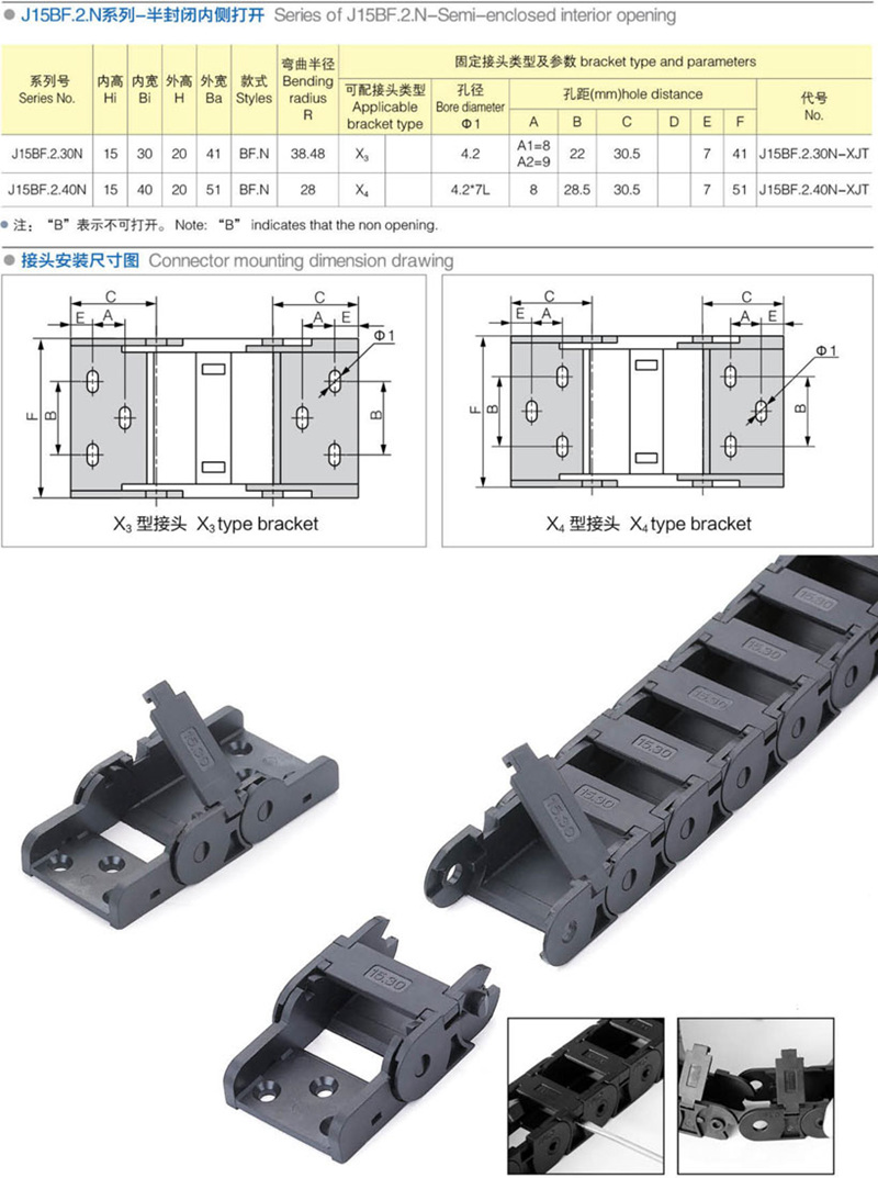 名稱:葉鏈 材質:塑料 分類:小型系列 系列號: J15BF.2.N 長度: 40pitch/m 內高: 15mm 內寬: 30-40mm 彎曲半徑: 28 38 48 應用機械:全部