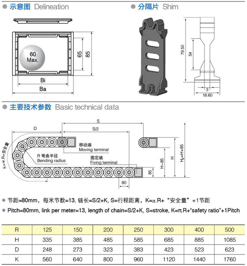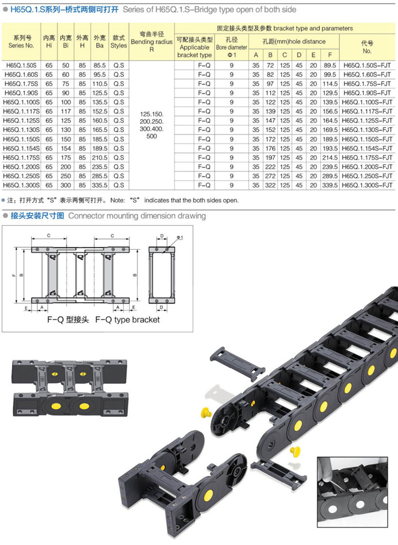 名稱:拖鏈 材質:塑料,尼龍 系列號: H65Q.1.S 長度: 13pitch/m 內高: 65mm 內寬: 60-200mm 彎曲半徑:125 150 200 250 300 400 500 應用機械:全部