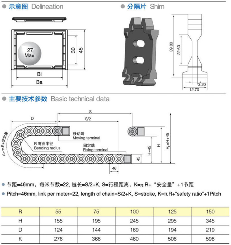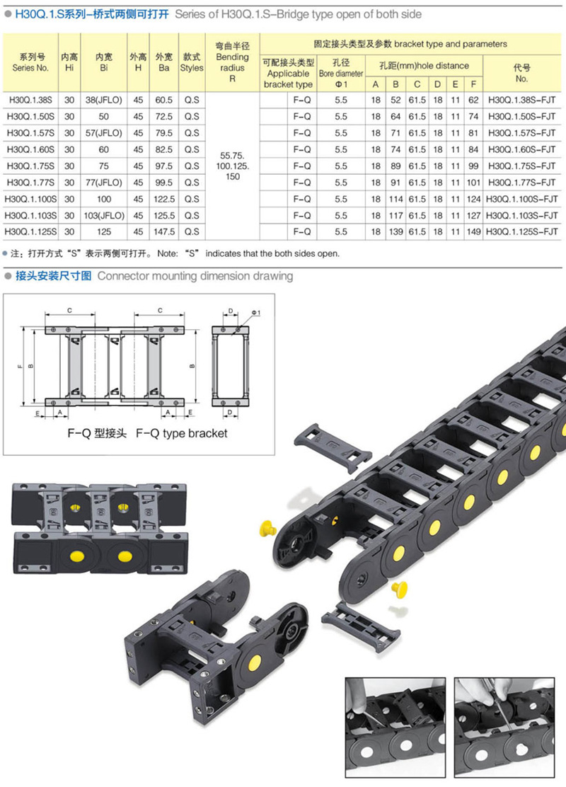 名稱:拖鏈 材質:尼龍PA66 系列號: H30Q.1.S 長度: 22pitch/m 內高: 25mm 內寬: 50-125mm 彎曲半徑: 55 75 100 125 150 應用機械:全部