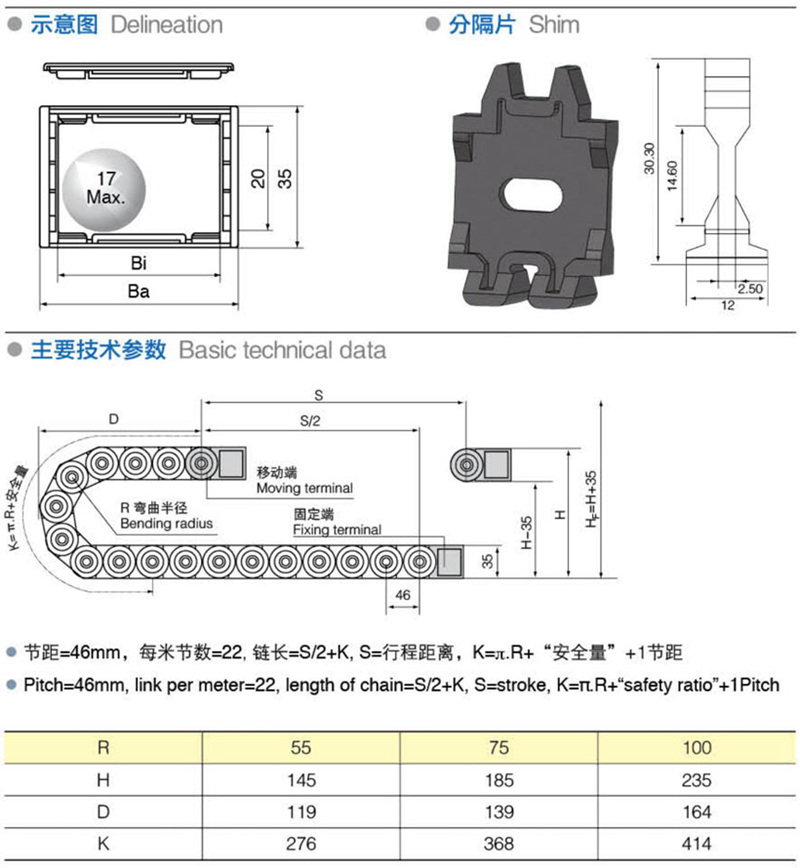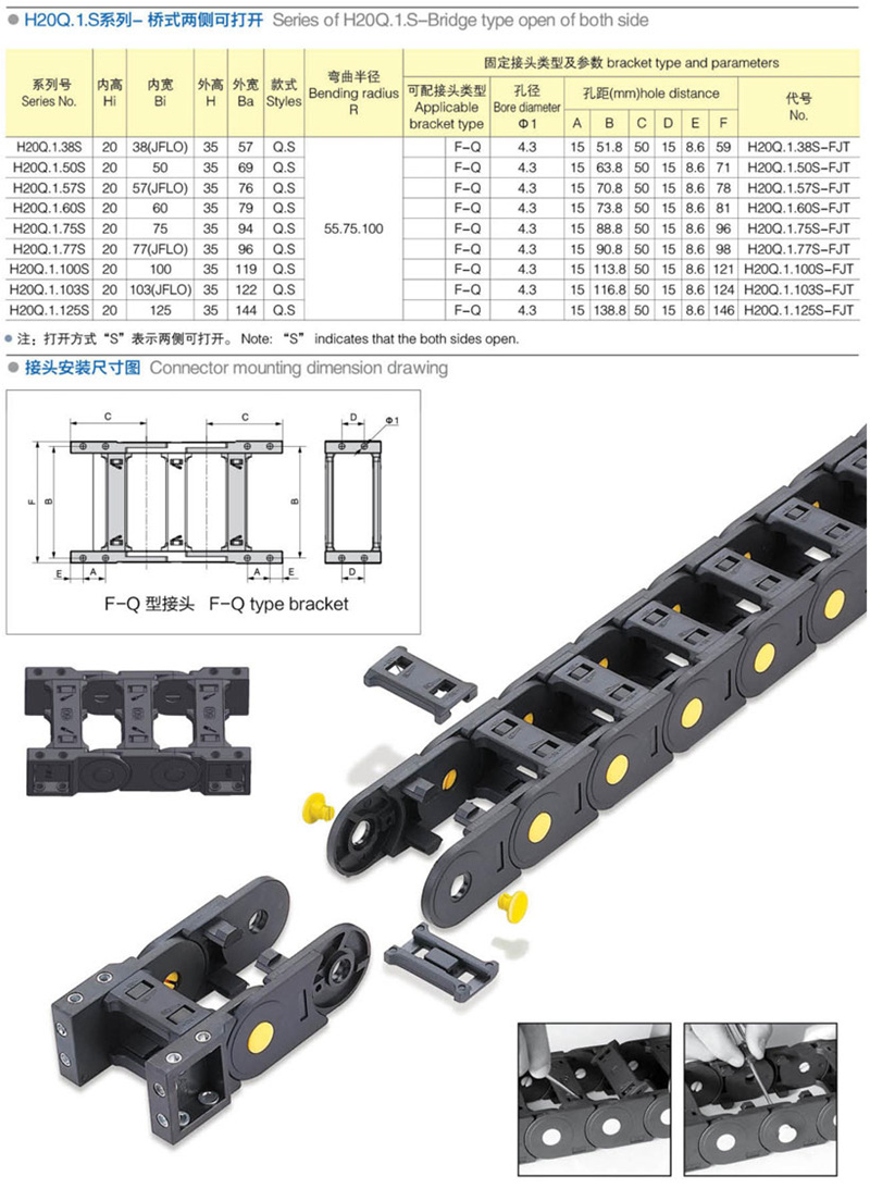 名稱:拖鏈 材質:塑料 分類:中型系列 系列號: H20Q.1.S 長度: 22pitch/m 內高: 20mm 內寬: 50-125mm 彎曲半徑: 55 75 100 應用機械:全部